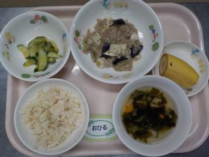おひる:ごはん、マーボーなす、甘酢きゅうり、わかめスープ、バナナ