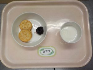 おやつ:牛乳、ジャムクラッカーサンド、プルーン