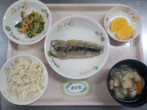 おひる:ごはん、さんまのかば焼き、三色和え、のっぺい汁、かき