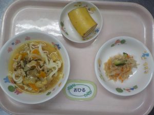 おひる:カレーうどん、切干大根サラダ、バナナ