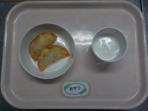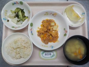 おひる:ごはん、厚揚げのミートソース煮、かぶのさっぱり和え、さつま汁、りんご