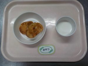 202510/16 今日の給食 給食oliva hoikushi おひる:ふりかけごはん、鮭ときのこのホイル焼き、だいこんのゆかり和え、厚揚げと青菜のみそ汁、かき おやつ:牛乳、ハニーラスク 補食:塩昆布おにぎり