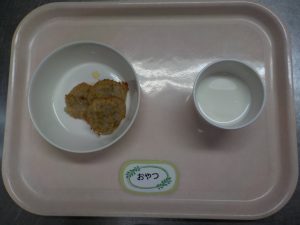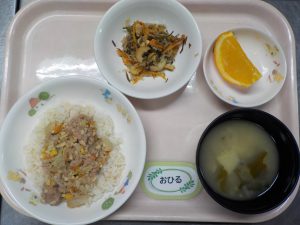 おひる:野菜そぼろ丼(納豆)、昆布イリチ、みそ汁、オレンジ