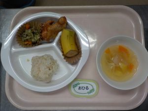202510/29 今日の給食 給食oliva hoikushi 今日はお誕生日会メニューでした。 おひる:ごはん、骨付きチキン、のりサラダ、スープ、バナナ おやつ:牛乳、お誕生日ケーキ 補食:わかめおにぎり