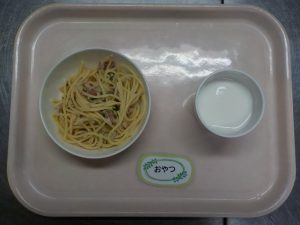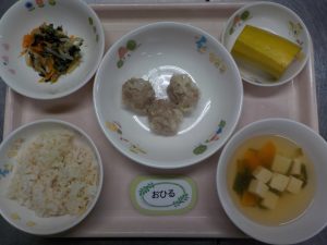 おひる:ごはん、シュウマイ、もやしと人参のナムル、豆腐スープ、バナナ