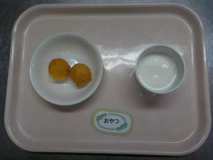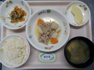 202511/04 今日の給食 給食oliva hoikushi おひる:ごはん、里芋の旨煮、もやしとわかめのナムル、ほうれん草のみそ汁、りんご おやつ:牛乳、かぼちゃドーナツ 補食:ツナと人参のおにぎり