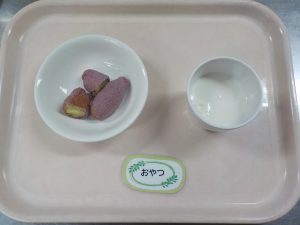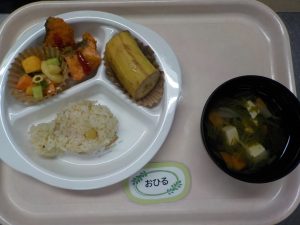 202511/06 今日の給食 給食oliva hoikushi 今日はキリスト教の行事である「収穫感謝祭」でした。神様のくださった秋の実りに感謝していただきました。 おひる:秋の実りごはん、さけのコーンフライ、かきサラダ、すまし汁、バナナ おやつ:牛乳、やきいもクッキー 補食:わかめおにぎり