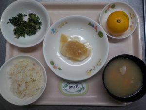 おひる:ごはん、カレイのみぞれ煮、ほうれん草のゴマ和え、豚汁、みかん