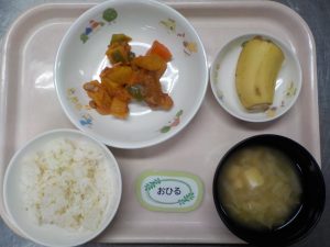おひる:ごはん、秋色酢豚、白菜と油揚げのみそ汁、バナナ