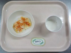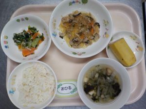 202511/17 今日の給食 給食oliva hoikushi おひる:ごはん、麻婆春雨、チンゲンサイの中華和え、はくさいとのりスープ、バナナ おやつ:牛乳、コーンのお焼き 補食:カレーピラフおにぎり