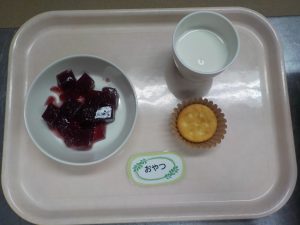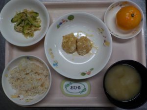 202511/25 今日の給食 給食oliva hoikushi おひる:鮭としらすの混ぜごはん、豆腐入り鶏つくね、切干ときゅうりのごま酢和え、かぶとなめこのみそ汁、みかん おやつ:牛乳、グレープゼリー、クラッカー 補食:おかかとすりごまおにぎり