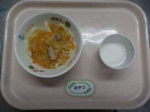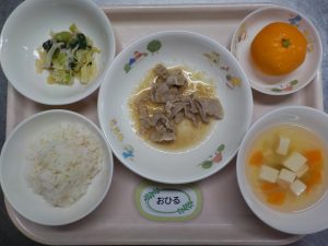 おひる:ごはん、豚肉のリンゴソース焼き、しょうゆフレンチ、豆腐スープ、みかん