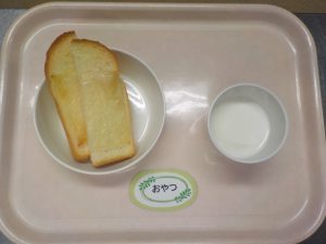 おやつ:牛乳、チーズトースト(豆乳チーズ使用)