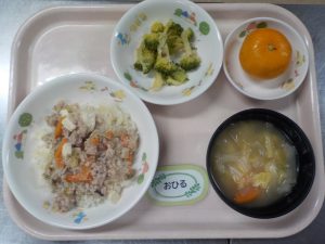 おひる:炒り豆腐丼、ブロッコリーのおかか和え、具沢山汁、みかん