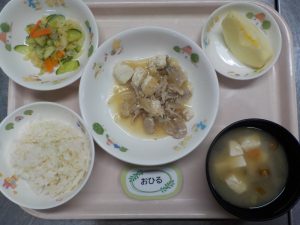 202512/08 今日の給食 給食oliva hoikushi おひる:ごはん、肉豆腐、白菜の甘酢和え、とうがんとなめこのみそ汁、りんご ※食材料の都合により、献立内容を変更しております。 おやつ:牛乳、かぼちゃのいとこ煮 補食:肉みそおにぎり
