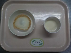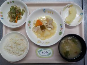 おひる:ごはん、おでん風煮物、磯辺和え、みそ汁、りんご