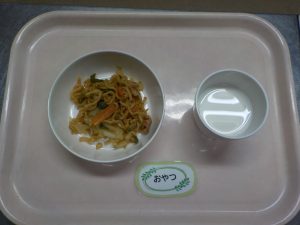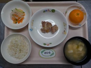 おひる:ごはん、鶏の幽庵焼き、なます風サラダ、五目みそ汁、みかん