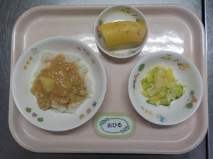 おひる:お豆のキーマカレー、ハワイアンサラダ、バナナ