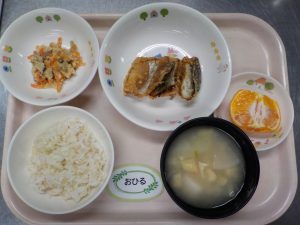 おひる:ごはん、さばの竜田揚げ、卯の花、みそ汁、ぽんかん