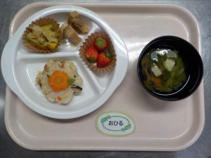 202603/03 今日の給食 給食oliva hoikushi 今日はひなまつり献立でした。 おひる:ひなまつり寿司、鶏肉の照り焼き、蒸し野菜サラダ、菜の花のすまし汁、いちご おやつ:牛乳、ひなまつりケーキ 補食:ゆかりおにぎり